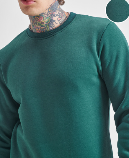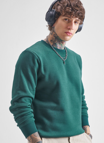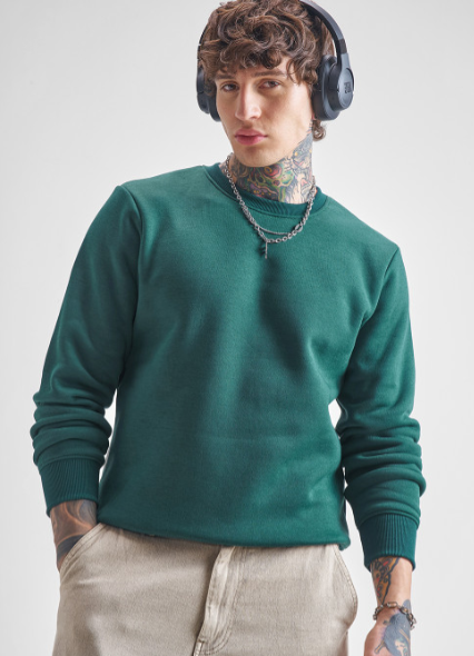 Green solid sweatshirt has a round neck, 2 pockets, long sleeves, closure, straight hem